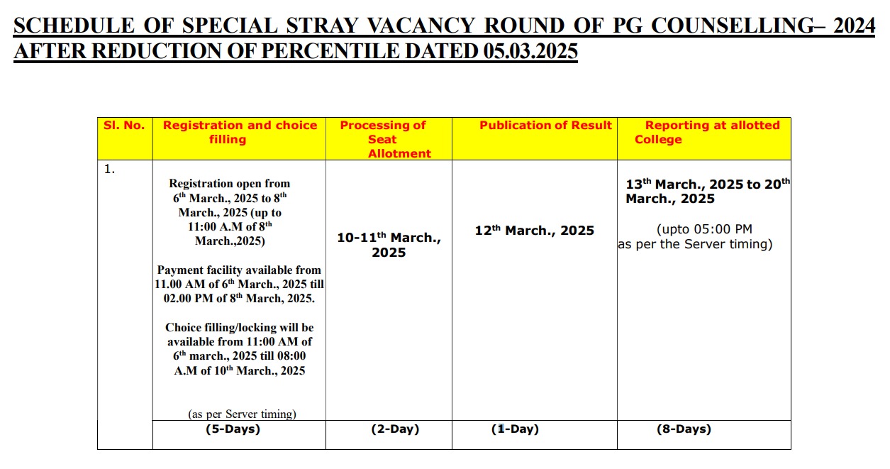 Note: Refundable Security Deposit of candidates who do not join the seats allotted to them in Special Stray Vacancy Round will be Forfeited and they will not be eligible to take NEET PG exam for Next Year i.e NEET -2025.